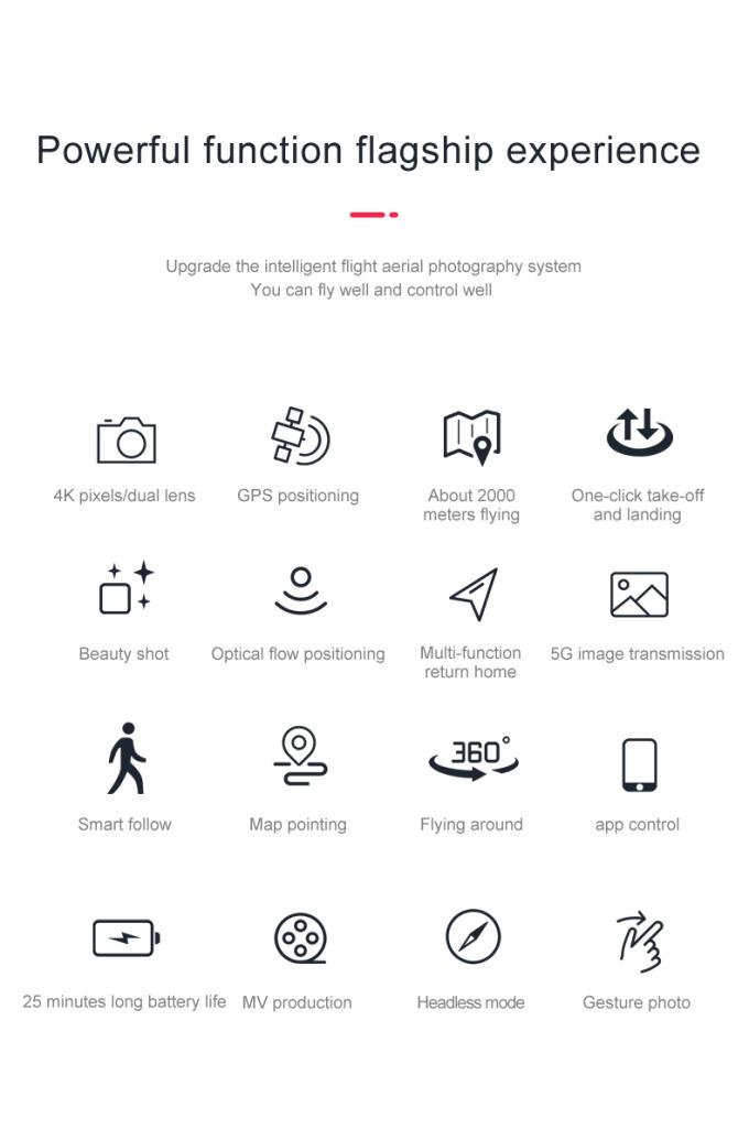 ขึ้น / ลง, ต่อไป / หลัง, ซ้าย / ขวา, การบินด้านข้าง, ความเร็วการบินระดับ 3, ไฟ LED, ติดตามฉัน, การบินรอบ, การบินจุดทาง, ระดับความสูง จับโหมด, โหมดไร้หัว, การกลับด้วยปุ่มเดียว,เริ่มขึ้น/ลงเครื่องด้วยปุ่มเดียว, WiFi FPV กล้อง / วิดีโอ